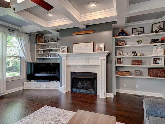 Welcome Home to this beautifully maintained 4 Bedroom 2.5 Bath Home located in Fieldstone Subdivision in Newburgh! Step through the inviting foyer, where you'll find a versatile living area to the left and an office and large laundry room to the right. Straight ahead, the spacious, open-concept kitchen and family room await. The kitchen features quartz counter tops, a new refrigerator and dishwasher, along with a new sink and backsplash, and lots of cabinet space along with a built in planning desk. The adjoining family room boasts engineered hardwood flooring, a gas fireplace with built in shelves, and beautiful coffered ceilings. Off the kitchen, enjoy a formal dining room complete with elegant wainscoting and matching engineered hardwood—perfect for entertaining. A convenient half bath completes the main level. Upstairs, you'll find a spacious primary suite with trayed ceilings, a private en-suite bath with a jetted tub, and a generous walk-in closet. Three additional bedrooms, and a full bath and are also upstairs. This home features a newer dual zone HVAC, Nest Thermostats, and newer ProVia energy efficient windows. Outside, you'll find a fully fenced in yard and plenty of room for patio furniture and entertaining. Seller is offering a Home Warranty for buyers peace of mind.