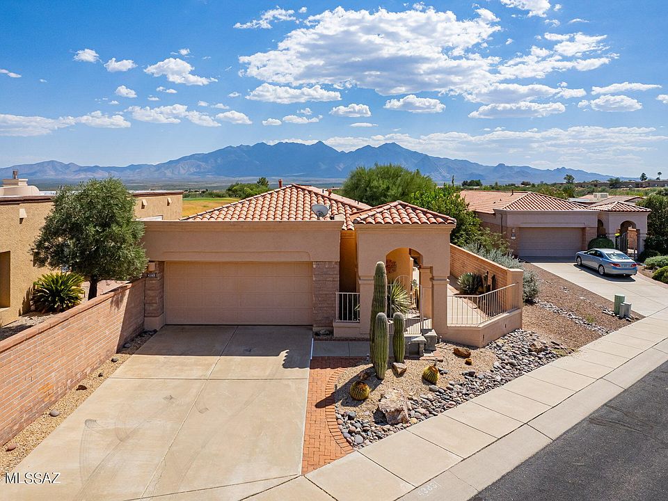 Incredible golf course and mountain VIEWS from the back patio of this lovely home in SI Ridge! Large enough to accommodate family and friends, but small enough to be super low maintenance, this home is the perfect winter get away! You will never get tired of spending time in the back yard, where the only thing you will see is the Santa Rita Mountains and the lush greens of the golf course. An Arizona room offers a more protected entertaining space, but still showcases those views! Inside, the living and dining areas look out onto the AZ room and back patio, and large windows let the natural light in. The views can be seen prominently from the inside, as well as out. The kitchen is spacious and sliders open up to a large breakfast area and convenient side BBQ patio. A powder room is adjacent, making it easy for guests. Your primary suite has a walk-in shower and closet and windows frame those incredible views! The guest en-suite is on the other side of the home, giving everyone a private retreat. With its beautiful mountain and golf course views, easy-flow floor plan, and proximity to golf courses and rec-centers, the only thing this home is missing is YOU!