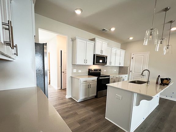 Built last year, this 3-bedroom, 2.5 bath townhome is in the popular Nexton area of Summerville, South Carolina. The two-story house features a master bedroom suite with double-vanity bathroom and walk-in closet, along with two other bedrooms and a 2nd bathroom and laundry room (with machines) upstairs, and a spacious living room area, open kitchen area with stainless steel appliances and tile backsplash, pantry, half-bathroom, and built-in bench/shoe cubby on the first floor. Other features: garage, driveway, central AC, tankless hot water system, and more.