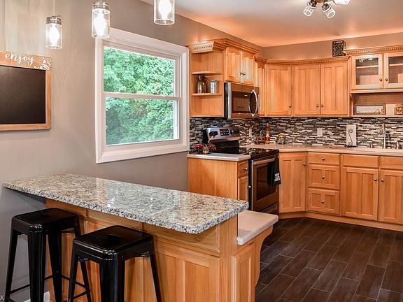 This stunning, remodeled 4 bedroom, 3 full bath house feels like home as soon as you enter! Beautifully landscaped with lovely curb appeal, a covered front porch and a private front patio. Gleaming, refinished hardwood floors greet you in the living room, around to the dining room, through the hallway and to the upper level bedrooms. Find your culinary inspiration in the gorgeous kitchen offering stainless steel appliances, a pantry with pullout drawers, tile backsplash, Corian countertops and a peninsula with a breakfast bar and granite counter. Open dining and living room with a picture window. The master suite offers 2 tall closets that take advantage of the whole height of the room! There's a remodeled master bath with a new vanity, beadboard accents, a walk-in shower and vinyl tile flooring. 2 additional bedrooms on this level. Good closet space plus multiple hallway built-ins. The main full bath has a new vanity and tile flooring. Downstairs, there's a family room, full bath, laundry room and fourth bedroom. The huge family room boasts an elegant fireplace, barnwood accent wall and a sliding door to the patio! Private backyard complete with a shed. 2-car rear load garage, too. This home is incredibly charming and includes a new hot water tank, A/C and windows. Completely move-in ready - don't miss out!