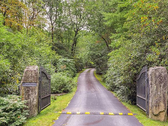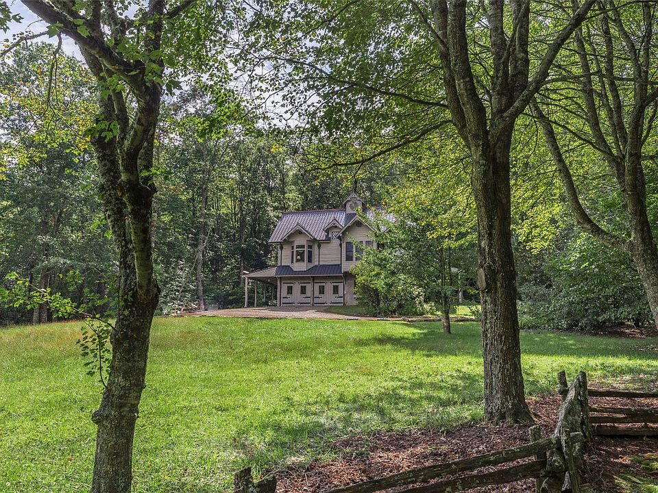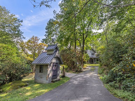 This is a rare opportunity to own acreage and one of the most unique homes in the area, and with views of Shortoff Mountain! 16.43 acres with two ponds, a custom-built house by Tommy Chambers, pump house, a large garage and an additional building. From the covered front porch, enter into a unique foyer with a wood-burning stove, stone floors and access to stairs leading up, the laundry room, a large game/viewing room and full bath. There is an elevator off the laundry that also can access the second level. As you walk up the stairs you are greeted with a generous family room with a large stone fireplace, and open to the kitchen and dining areas. Note the details like wood ceilings and beams, bay windows, stained glass windows, custom wood cabinets, old doors with transoms and unique lighting fixtures. The primary suite is located on this floor as well as a second bedroom and bath. Enjoy views of Shortoff Mountain from the dining area or primary bedroom. The upper level has a room that could be a studio, office or playroom and the third bedroom. The antique pine logs (circa 1865) are from a cabin in Thomasville, Georgia and the antique heart pine wood (circa 1875) is from a railroad station in Charlotte. The roof is a standing-seam metal, there are copper gutters with antique scuppers and lightning protection. Outside is a stone terrace and a covered area perfect for outdoor dining. The house overlooks a meadow with fruit trees, bushes and vines, and a double-door garage with workshop and unfinished second floor. Follow the asphalt drive that borders the property to view the 16-acre property, two ponds, an additional building and underground utilities. Use as a private mountain retreat or subdivide the acreage up to 4 additional estate lots. Only minutes to downtown Highlands, ranked America’s Best Small Mountain Town by Travel & Leisure Magazine in 2021.