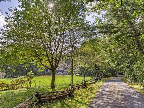 Large stone fireplaceViews of shortoff mountainWood ceilings and beamsAntique pine logsStained glass windowsDouble-door garage with workshopTwo ponds