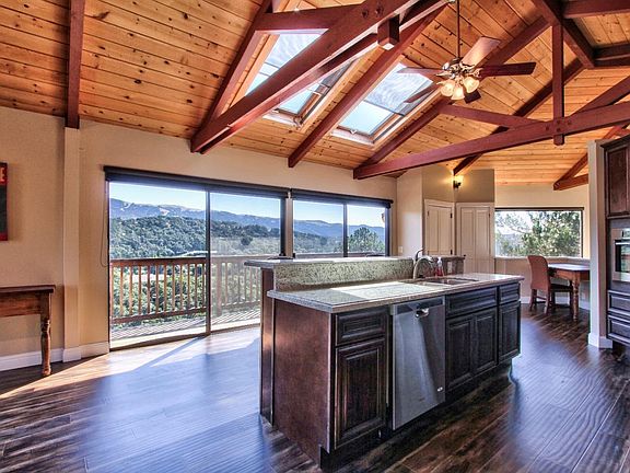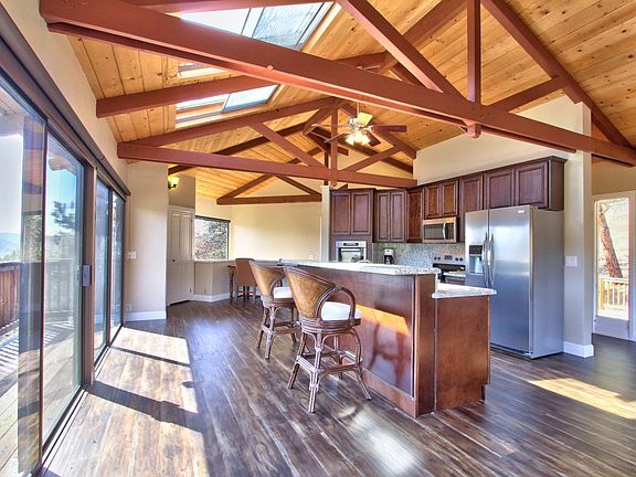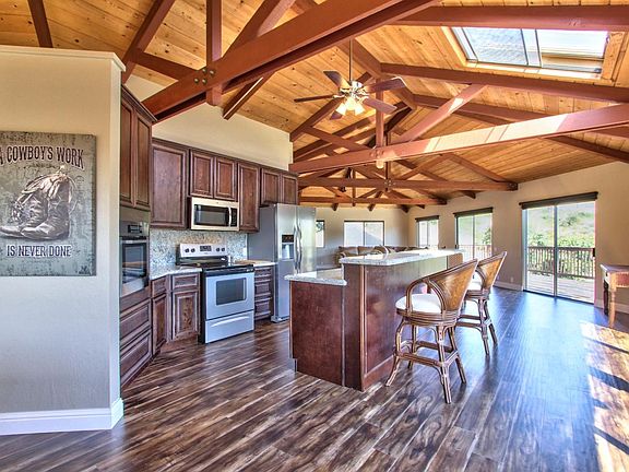 Come soak up the Sun and Panoramic mountain views all on 2.5 acres. Open floor plan with open beam ceilings. Kitchen has granite counter tops and sitting bar. Upstairs living room has large deck with valley views. Master bedroom sits on main level with large closet space and spacious master bath. Downstairs offers family room, two bedrooms, bathroom with tile stall shower, and laundry room. Enjoy the huge deck downstairs with storage room and plenty of yard for that summer time BBQ and garden. There is a large 2 car garage attached to with cabinets and work space area for those home projects. Property offers nice area for those kids 4-H animals or extra parking. All decks have been updated, cleaned, and resealed for that like new shine. Come see and enjoy.