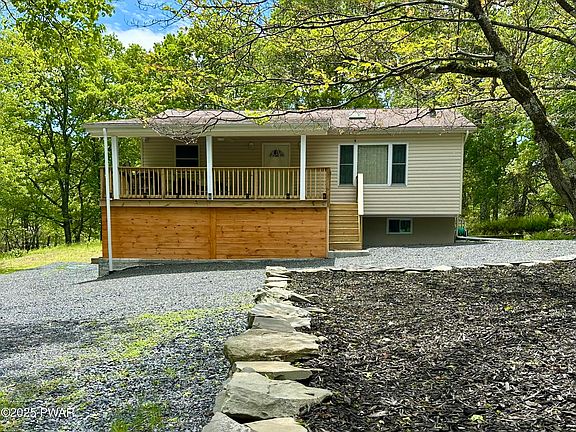 Move-in Ready and Fully Renovated - Just in Time for Summer! Welcome to your perfect Poconos getaway or year-round retreat, where peaceful nature meets convenient proximity to city life. This fully renovated home showcases modern comfort and style in every detail--from new flooring throughout to modern fixtures. Enjoy a brand-new kitchen with stainless steel appliances with room to add a kitchen eat-in island, sleek modern baths, and energy-efficient split units for year-round comfort. Smart home features, including motion-sensor bidets and split heating and cooling on both levels, elevate everyday living. A charming wood-burning stove and new skylights bring warmth and natural light, while Andersen replacement windows, two brand-new decks, and a freshly graveled circular driveway offer both beauty and function. The covered area beneath the deck provides dry storage for your tools and toys, and a lower-level entry adds convenience for unloading. Additional updates include a brand-new septic system and radon mitigation for peace of mind. Located in an amenity-filled community just two hours from major metro areas, this turn-key home is ready for your next chapter in the Poconos--just unpack and enjoy!