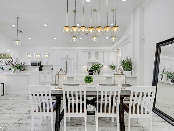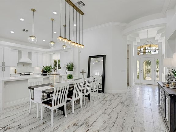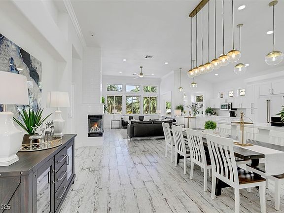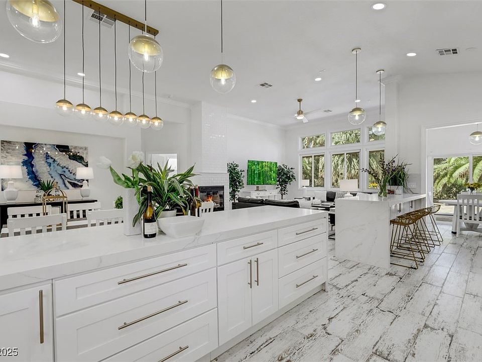 High ceilings with tall white brick fireplace, rustic weathered white wood look tile floor, white marble look tile slabs in master bath, white marble look Quartz counters, white GE cafe applianes, gold ball lights and accessories, gorgeous yard with rose garden and golf course view, so quiet, serene and peaceful.