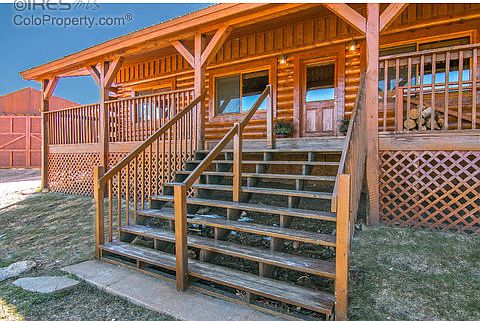 Beautiful log home zoned for 2 horses on fenced 3.1 acres.Nestled in the Ponderosa pine, this 2-story home features spacious front porch overlooking open space.Stone waterfall, deck, patio & fire pit. Vaulted ceilings & beetle kill pine floors. Main has great room, dining, kitchen w/wormy maple cabinets.Master bedroom w/ jetted tub, plus 2nd bedroom & bath. Upstairs has 3rd bedroom, bath, & loft. Pole barn for horses/garage.Private access to 3 ponds,& National forest for hiking, hunting,fishing