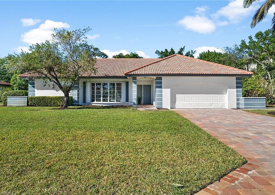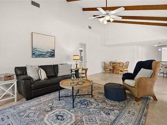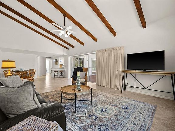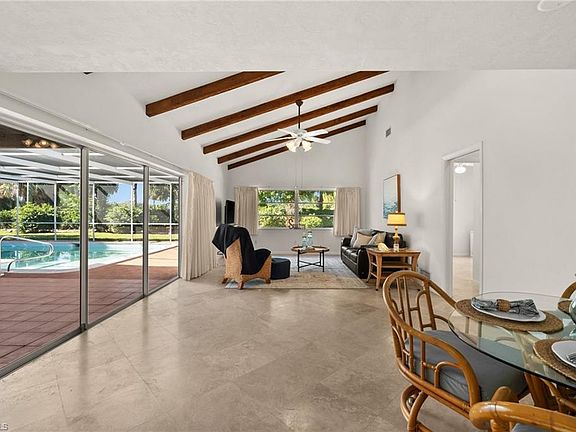 This three-bedroom, two-bath, two-car garage, one story home overlooks La Playa golf course (membership optional) in Palm River Estates, a quiet residential neighborhood close to shopping, dining and the beach. The spacious floor plan includes a living room/dining room and a an extra large family room that both open to the lanai. The primary bedroom includes an en-suite bath, two sinks and a walk in closet. Two bedrooms on the opposite side of the house share a full bathroom with a large seated walk in shower. Step outside to your private backyard oasis: a large covered area with 15 x 30 foot swimming pool, and a row of shade trees fronting a high privacy hedge. This property offers a large, open floor plan on .29 acres in an upscale community at an affordable price.