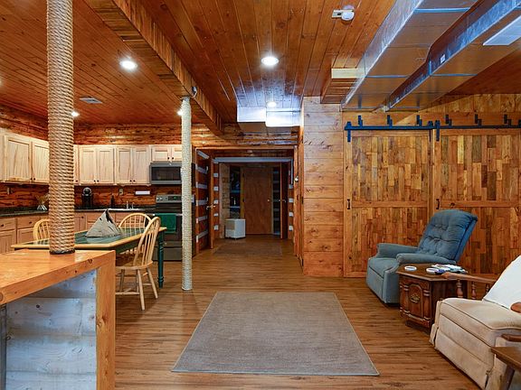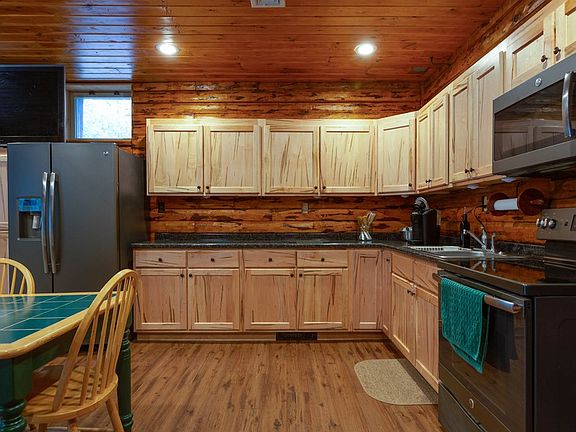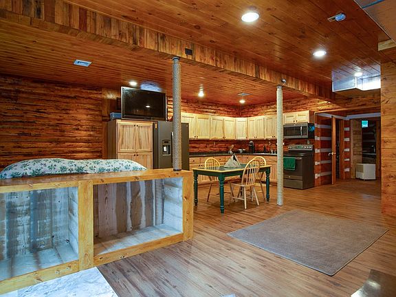 Hunters paradise on 26.47 acres. Beautiful 1 story log cabin, situated in the woods on top of the hill. The cabin has an open Living Room / Kitchen / Dining Room Combo, 1 Full Bath and 2 Bedrooms. The home sits on a concrete slab with vinyl flooring and radiant floor heating, keeping it very toasty on those cold Wintery days. In the Summer, enjoy the comfort of the Central A/C. There is a newly completed Stone Hearth area that the woodstove sits on. The Kitchen cabinets are custom made Maple crafted by local Amish men. Outside, there are several sheds for all of your storage needs including a 1 car garage with attached carport area, a metal carport, wood shed, several other storage buildings. Down below, the house has a very nice pond with newer dock for swimming. Overlooking the pond is a large picnic pavilion that allows for fantastic views of the surrounding mountains. There are 2 storage buildings down at the pond and there is electric to the pavilion and one shed.