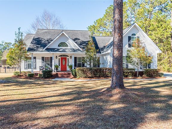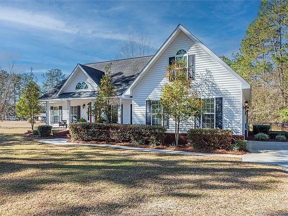 Nestled on 5.51 serene acres on the outskirts of town, this charming traditional southern home offers the perfect blend of comfort and beauty. Each day, you'll have the choice to enjoy the front-porch views of a picturesque pond or relax on the screened-in back porch overseeing the fenced-in backyard, both perfect settings for morning coffee or evening sunsets. Offering three-bedrooms and two-full bathrooms, the thoughtfully designed layout features custom cabinetry, intricate wainscoting and trim, a two-car garage, a welcoming entryway, and a versatile bonus room upstairs for the perfect flex space. On the property, one will also find a storage shelter large enough for an RV as well as a batting cage for recreation.