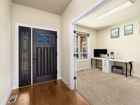 Nestled in the sought after Vista Pointe subdivision, this stunning 2,047 square foot home built in 2012 offers breathtaking RoxyAnn Peak views from every room. Featuring 3 bedrooms, 2 bathrooms and an office/den, the open floor plan has hardwood floors, a gas fireplace, vaulted ceilings, and expansive windows throughout. The recently updated, gourmet kitchen includes granite countertops, stainless steel appliances and a pantry. The primary suite features new, high-quality carpet, a walk-in closet, double vanity, soaking tub, and separate shower. Enjoy the outdoors on the Trex balcony, stamped concrete patio, or in the swim spa, all within a fully fenced and landscaped corner lot. Take a look today!