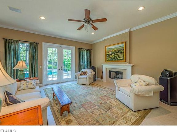 H.9504 - This gorgeous custom home with its wide open floor plan & soaring ceilings allows you and your loved ones to enjoy the serenity of a beautiful country setting just minutes away from Naples shops, restaurants & beaches. Bordered on two sides by undeveloped land, this home nestles upon just over 2.5 acres of private, thoughtfully-landscaped grounds where just the right amount of trees dapple its surroundings with a mix of sun & shade while still allowing gentle breezes to comfort you. A newer wireless security system has been installed, Nest thermostats keep the interior cool, & a whole house reverse osmosis system is a pure joy. The living areas are blanketed in tile while polished marble graces the master bath. Granite counters adorn the kitchen & baths, and the home is equipped with high-end appliances & a newer front-load washer & dryer. The master bedroom boasts a wonderful sitting area with fire place and a large walk in closet. French doors from the great room lead to the open-air salt water pool/spa & pool deck that is sure to be site of many get-togethers.