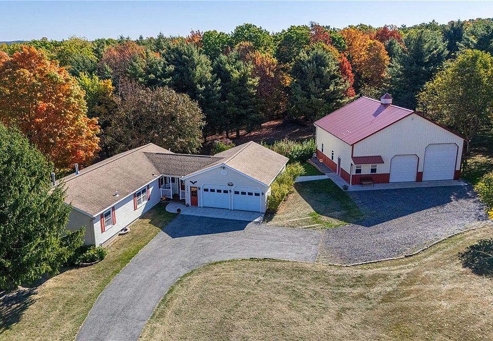 Just Listed! Scenic 5-Acre ranch with amazing outbuilding. Welcome to 4391 Egypt Rd, a beautifully maintained ranch home offering the perfect blend of comfort, functionality and country charm. Nestled on 5 wooded acres, this property features a 3-bedroom, 2-bath home with easy single-floor living and wonderful updates. Inside, you’ll find hardwood floors, a cozy stone gas fireplace, and a bright, open floor plan. The updated kitchen includes granite counters, stainless steel appliances, and ample cabinetry. The modern primary bath boasts radiant heated floors, a custom tile shower, and rustic wood accents. Convenience is key with first-floor laundry and a full walkout basement complete with workshop space. The attached heated 2-car garage provides year-round convenience, while the impressive 40x42 outbuilding offers oversized doors, water, electric, and a loft, perfect for hobbyists, car enthusiasts, or storage needs. Step outside and enjoy scenic surroundings with a gorgeous private wooded backdrop. Whether relaxing by the fire, tinkering in the shop, or exploring the land, this home offers something special for everyone. Perfectly situated in the Finger Lakes, minutes to amenities, Bristol Mountain, hiking and more. Delayed Negotiations on Monday, October 13th at noon.