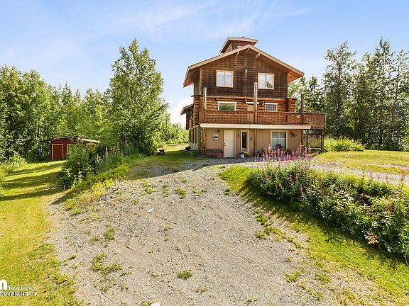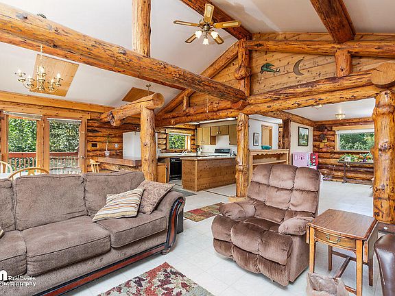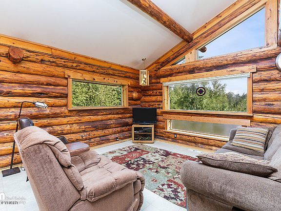 True log home with gorgeous view of the Chugach Mountains! Open concept living area with vaulted ceilings and surrounding windows that provide natural light and views of the beautiful scenery. With over 2400 sq ft, this home includes 3 bedrooms, downstairs den and a loft that could both be used for additional bedrooms. New deck overlooking the private 1.5 acre yard. Plenty of room for storage under the deck and in the large shed. Make this home your own today, call to schedule your showing!