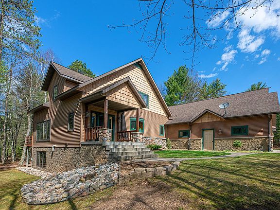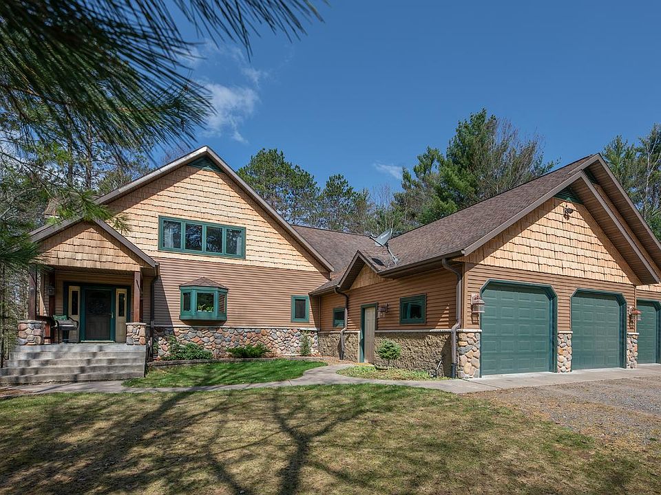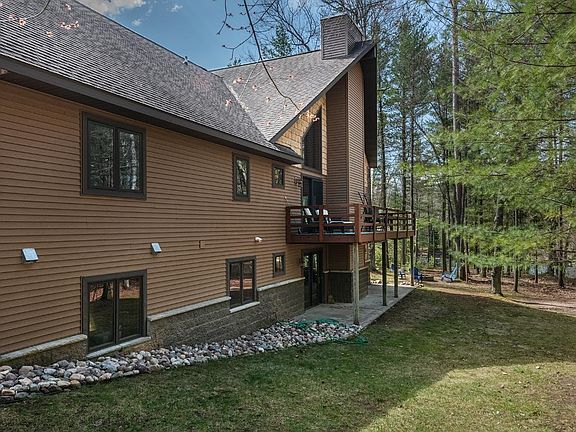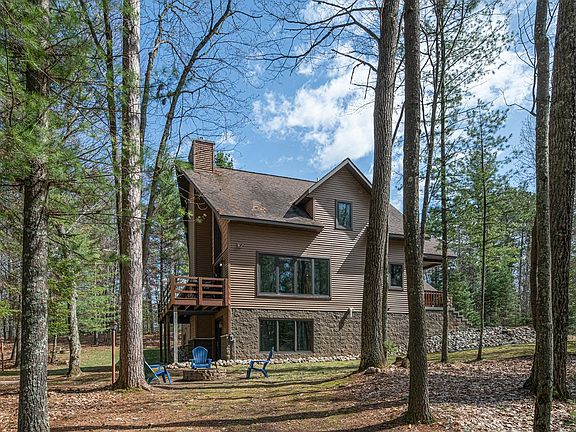 "A river runs through it..." can be said of Pine Lake Creek running thru this SERENE, SECLUDED 2.38 acres of forested lands. 3770 sq.ft. 4bd/4ba home has cathedral ceilings, massive windows bringing the "cathedral of the woods" teaming w/abundant wildlife into the open concept living/dining/kitchen area where storage knows no bounds - cabinets galore, TWO pantries w/custom shelving & NEW: frig, gas stove, kitchen & prep sinks, micro. Center island & tons of counterspace make it a culinary dream come true. Large laundry room, powder room, full bathroom & two bedrooms complete main level. Master ensuite w/ MASSIVE walk-in closet, lower level family room w/wood burning stove, bar, 4th bedroom & full bath. All rooms have been freshly painted, new carpeting, new light fixtures/bath fixtures -full list of improvements in documents. HEATED 3-carage garage for boat/toys, fenced-in raised-bed garden area(OR convert it to a 24x48 garage), permanent pier. Convenient location to Menards, shops.
