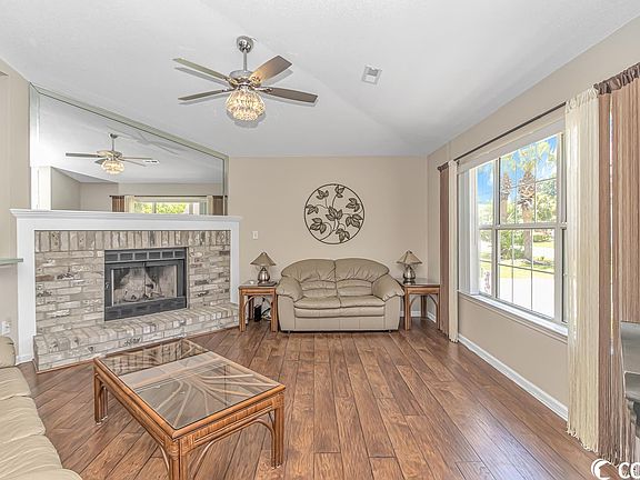 No HOA! Are you looking for a home in Myrtle Beach with no HOA and no carpet? This is the home for you. The interior flooring is a warm and inviting hand scraped laminate flooring in the main living area and bedrooms, plus custom designed tile in the Carolina room and wet areas. The large open floor plan of the living room has a brick fireplace, a beautiful glamorous ceiling fan, cathedral ceiling and is open to the kitchen. The kitchen has stainless steel appliances and a lazy Susan that maximizes the cabinet space. The Carolina room features beautiful french doors, a circle top window, custom laid tiles and newer sliding doors leading to the vast rear yard. The main bedroom is quite large and features a modern ceiling fan, tray ceiling and a walk in closet. The main bath has double sinks, a large tub, a shower and 2 beautiful windows that allow lots of natural light to flood the bathroom. The hall bathroom has been updated with a new cabinet and granite top, custom grey tile and features a transom window above the shower to allow in natural light. The front exterior of the home is landscaped with beautiful mature palm trees and a double car driveway plus the large rear yard is extremely private and backs up to a wooded buffer of trees. The driveway can easily accommodate a large RV. Call to see this one of a kind home today!