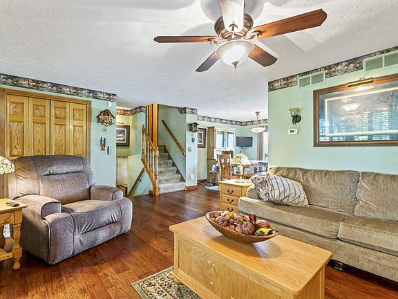 Serene country living on 5 acres! Enjoy comfort & privacy while remaining conveniently located to nearby amenities. This spacious 4-level split home offers 2,176 sqft of versatile space. The entry level features an open kitchen, dining and living room with beautiful hardwood floors. On the upper level, discover 3 bedrooms and 2 full baths, including a primary bedroom with an en-suite. Relax by the fireplace in the lower family room or retreat to the semi-finished basement - a flexible space that's perfect for a game room, man cave, or entertainment area. Additional 24x24 pole barn/garage with concrete floor for all of your storage & hobby needs. The expansive yard, complete with buckeye, apple, and walnut trees, presents endless opportunities for gardens and outdoor activities.