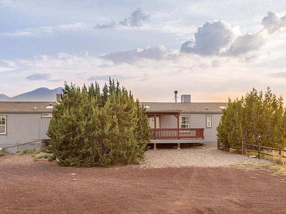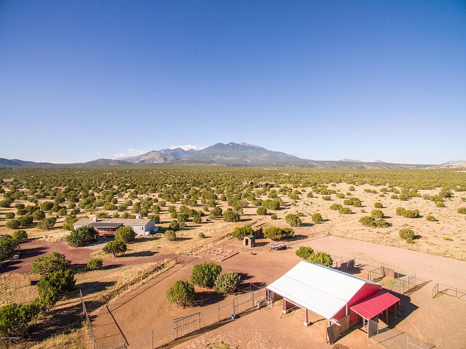 Enjoy 360 breathtaking views, including the San Francisco Peaks from this great country property. The 10+ acres are fully fenced and crossed fenced with multiple pasture areas (some have auto waters) for horses, goats and all of your farm animals. Property has large open barn/workshop and many covered/enclosed stalls. Cindered and rock circular driveway. Home has vaulted ceilings, open floor plan from kitchen, dining and living rooms. Split floor plan with large master bedroom with great Peak mountain views. Master bathroom is light and airy with garden tub and 2 sinks. Kitchen is bright, has blaze king stove, nice back splash and island. There is a 5000 gallon water cistern and 2 add'l water catchment cisterns. School bus comes by for pick up into Flagstaff.