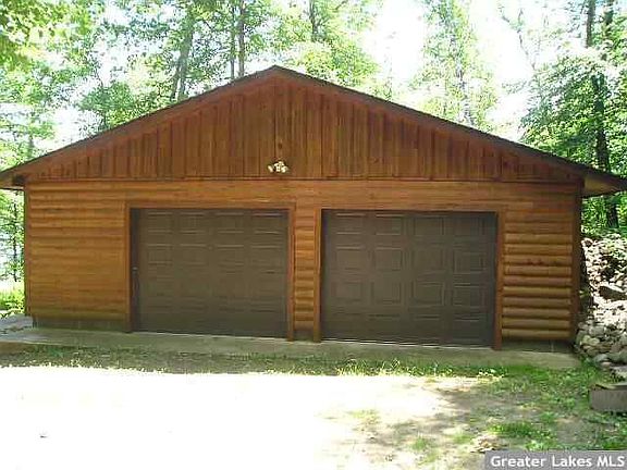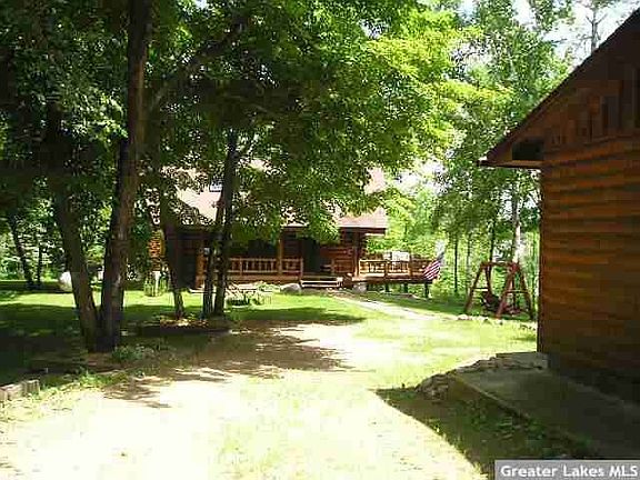 Full log masterpiece cabin on north shore of a great fishing rec lake w/ 158' sandy shore next to 100's of acres cty land w/trails to explore yr round. This 2+ bed, 2bth chalet with full W/O and loft includes hard wood floors, 2 fp, sauna, new bar, huge deck, and 4 stall gar. End of road privacy yet only 3 miles from Golden Eagle golf. Up North!!