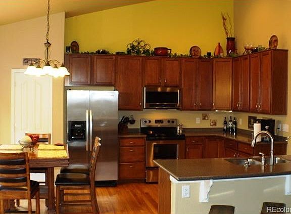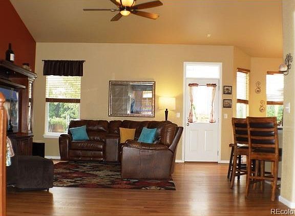 Desirable south facing 3 car garage Ranch home with finished basement. Features 5 bedrooms, 4 baths, lots of hardwood floors, tile, composite tops, vaulted ceilings, tall walls. Ultimate man cave finished garage is gas radiant heated, has a multicolored epoxy floor, evaporative cooler for summer use and a roof vent fan. 3 of the bedrooms have their own private baths. Easy access to I-76/Hwy 85 and shopping.