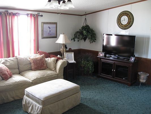 HUNT IN YOUR OWN BACKYARD! Move-in ready 4 BR, 2BA doublewide on 6.3 acre lot. Recent replacements and upgrades – new kitchen and bath room floors and new washer and dryer. Formal living room and dining room plus family room open to the large eat-in kitchen Living room and family room share a double fireplace with gas logs. Cathedral ceilings throughout. Master BR w/ garden tub, separate shower, & double sinks. 6.3 acre lot provides plenty of room for gardening and horses, and a DEER STAND.