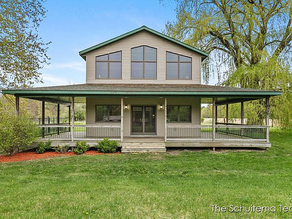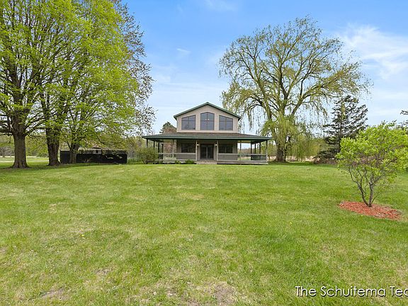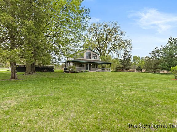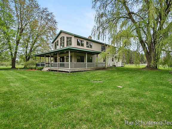 This unique property gives you all the benefits of country living while being a short drive into the city, less than 30 minutes to downtown Grand Rapids. Although you are in the country, fiber optic internet is already connected to the home. This home is located on a serene 5 acres of mixed woodlands and tillable land allows you the opportunity to make your homestead into whatever you would like. A covered wrap around front porch and large back deck give you the ability to entertain in the beautiful Michigan weather, rain or shine. The large kitchen features one of a kind live-edge pine countertops with ample counter top space and plenty of storage. Included in the open floor plan is a sitting room or potential dining room with a beautiful natural stone wood burning fireplace equipped with a mantle and blower. Need more bedrooms? The formal dining room could be easily converted to a 3rd bedroom. The show stopping living room off the main floor is expansive, with 23' cathedral wood ceilings. Loads of natural light flood in from the double level Anderson windows. Heading upstairs, you'll find ample amount of storage with a large storage and linen closet in the main hall, a large bathroom with double sinks, and two over-sized bedrooms. The master includes a large walk-in closet with hidden storage, loads of space and a private balcony overlooking your gorgeous property. The second bedroom is oversized with two large closets. The opportunities are endless to make this place your perfect forever home!