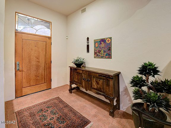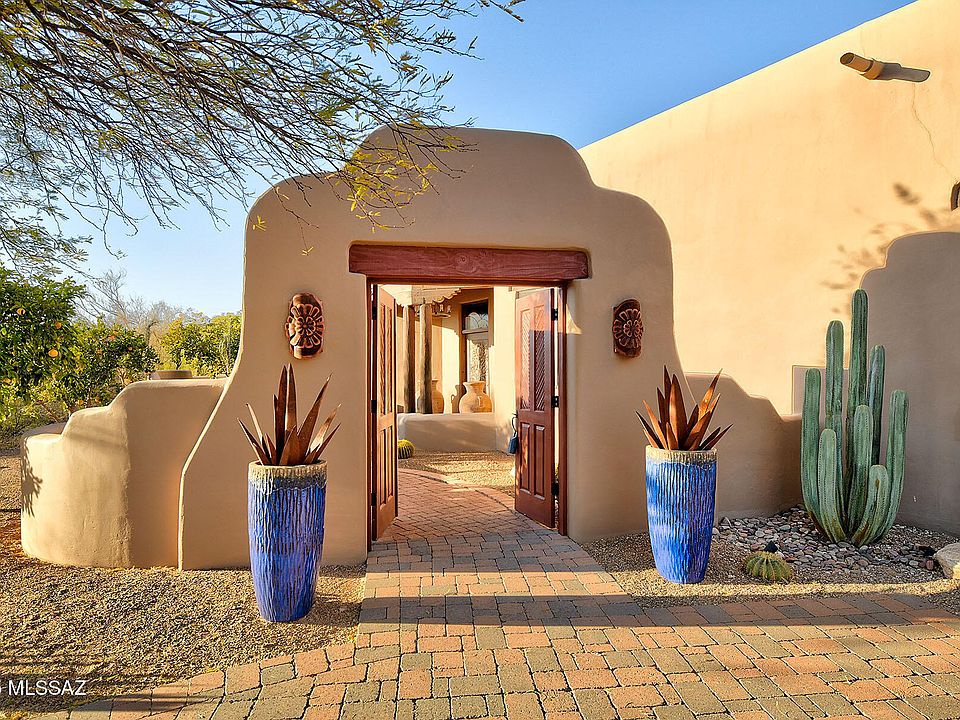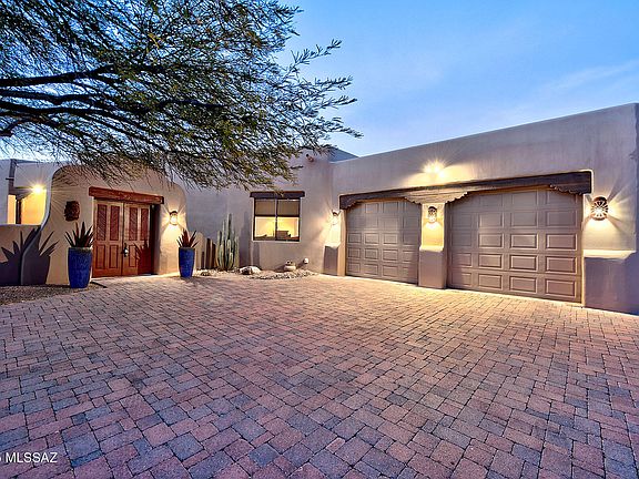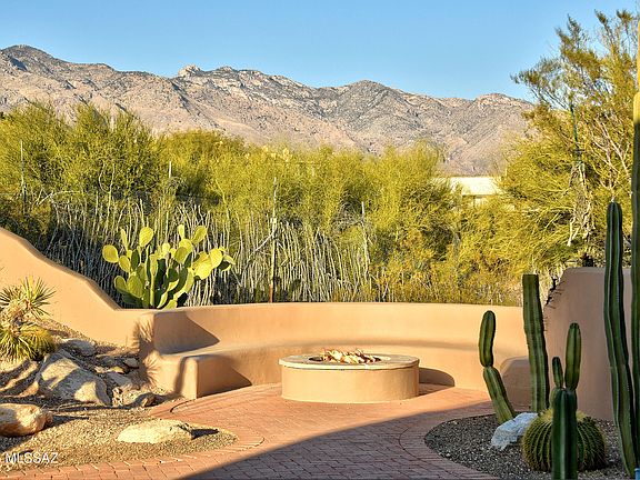 Discover this Southwestern/Santa Fe-style retreat nestled in the sought-after Catalina Foothills near Alvernon and River Rd., offering excellent views of the Catalina Mountains. Situated on a sprawling .94-acre lot within the prestigious gated community of Bellas Catalinas Estates, this home sings of charm and sophistication at every turn. A concrete paver driveway and gated, arched entry lead to a serene courtyard with citrus trees and a stunning hand-carved front door. Step inside this beautifully crafted 2,678 sq. ft. residence, featuring 3 bedrooms, 2.5 baths, and a 2-car garage--all designed with timeless elegance and no interior steps. The home boasts brick herringbone and concrete flooring, soaring ceilings with rustic viga beams and corbels, and a two-way fireplace seamlessly connecting the family and living rooms. The kitchen is a culinary delight, offering concrete countertops, knotty alder cabinetry, vibrant Talavera tile accents in cobalt, sage, and periwinkle, a cozy breakfast nook, and an adjacent versatile office/crafts room. The primary suite includes concrete countertops, dual vanities, a walk-in closet, and direct access to the serene backyard. The expansive, walled-in outdoor space is an entertainer's dream, featuring a covered porch with exposed beams, brick paver flooring, lush landscaping, citrus trees, a spool, banco seating, and an outdoor fire pit,all set against the stunning backdrop of Catalina Mountain views. This classically elegant home, infused with rich Mexican-inspired design, truly captures the essence of Tucson living. Don't miss this rare opportunity to own a masterpiece in one of Tucson's most desirable neighborhoods!