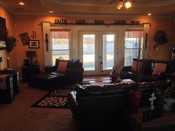 This 7 year old home has 4 bedrooms, one office and a bonus room upstairs that can be used as a bedroom, game room or man cave. 4.5 bathrooms. Great walk in closets. Extra large master bedroom with heated floors. 2 garages one attached and one detached connected by a drive under for parking. Large walk in pantry in the kitchen. Home has media closet and security system. Large back yard with vinyl fence. Safe room/ hidden room . Sits on 3 acres and only two miles from town. Security System wired for all doors and windows.
