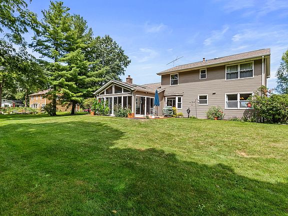 Country living but close to town! Nestled away this 2 story home is an acre wooded lot in a quaint subdivision with access to a small lake and park, it is very tranquil. Inviting Front Porch with views of the fruit trees in front yard, leads you into the home with 4 Bedrooms and 2.1 baths with just over 2100 sq ft. Main level offers a living, large dining room, open eat-in Kitchen with breakfast bar. Just off the Family room is a 3-season room with vaulted ceiling, skylights great additional space with an extra 200 sq ft.! 2nd floor features 4 bedrooms and 2 full updated bathrooms. Full basement with small finished space but ready for new ideas to finish the rest or great for tons of storage. The backyard features beautiful perennials through-out, patio, garden space, and 2 sheds with electric service surrounds the firepit in the wooded space. Side load garage with wide driveway. Easy access to downtown Elburn, train station, I-88 and shopping in all directions nearby.