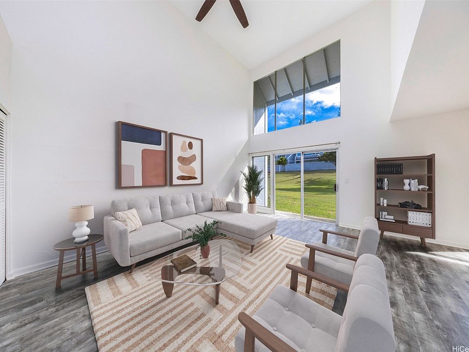 Tucked away in desirable Kaneohe, Yacht Club Terrace is ideally positioned just one block from the Kaneohe Yacht Club, Keaalau Neighborhood Park, and just minutes from Kaneohe's shopping hub and convenient freeway access. This rarely-available 4-bedroom townhome is a true gem. Step inside through a private, gated, and landscaped courtyard – a perfect space to personalize with your own outdoor touches. Inside, a soaring living room with dramatic two-story ceilings welcomes in a bright and open atmosphere, inviting ample natural light. The entry level also boasts an upgraded kitchen, a dedicated dining area with stylish built-in cabinetry, multiple storage options, and the primary bedroom suite. Upstairs, three additional bedrooms, two with their own lanai space, and a second full bathroom offer plenty of creative flexibility. 4-bedroom townhomes in Hawaii are a rare find; this exceptional opportunity at Yacht Club Terrace is a must-see. Listing includes enhanced, virtually staged photos.