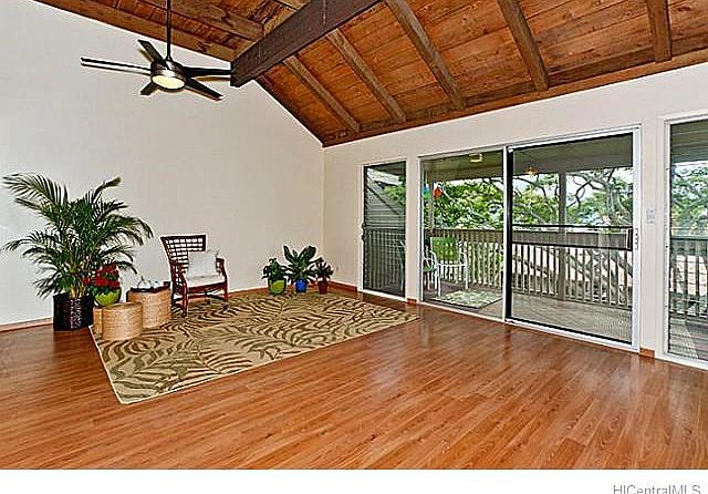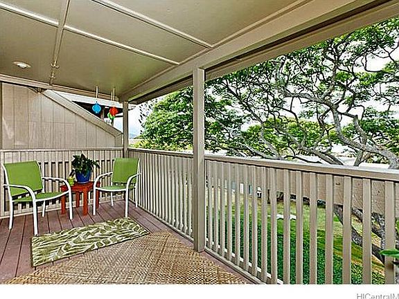 Spacious main floor w/the master bedroom, bathroom, and charming front courtyard. Enjoy the breezy, tree top views of Kaneohe Bay while relaxing on the covered lanai. Open living area w/nice high ceilings, lots of natural lighting. Downstairs boasts 2 bdrms & a full bathroom, w/tile floors. Close proximity to H-3, solar water, 2 parking spaces located in front of home. Desirable corner location.