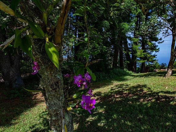 Beautiful mature landscaping including magnificent orchids, rhododendrons, bromeliads, citrus trees, iris, ti plants, podocarpus, eucalyptus and Norfolk pines. Built-in barbecue pit looks out over producing avocado and orange tree with blue ocean views in the distance. There are several producing banana patches at the rear of the home with an orchard of Macadamia Nut trees throughout the parcel.