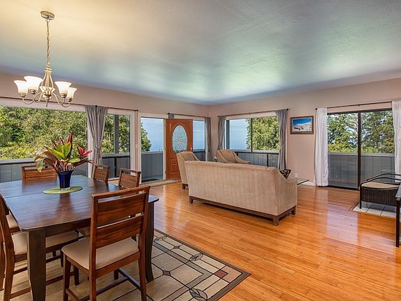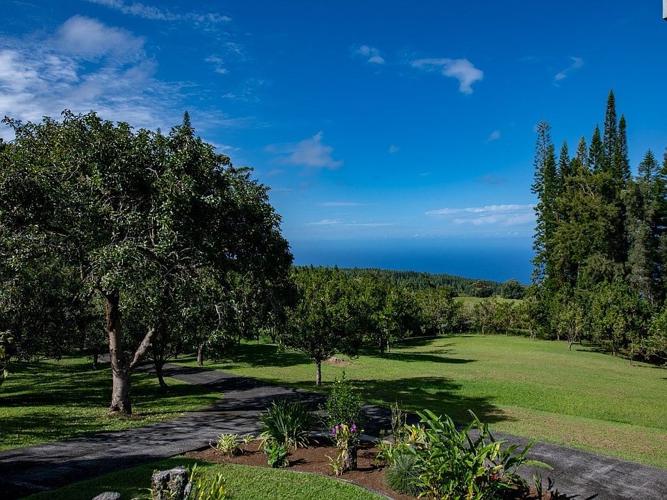 Welcome to the cool climate of Kalopa Mauka and the expansive ocean views available from this beautiful 5-acre parcel and home that has been meticulously maintained. Concrete driveway leads through a mac nut orchard with the home placed on a hillside for the optimum ocean view. Covered porch leads to the front door entry and around to the rear of the home.