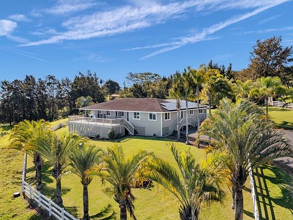 Come home to this amazing 12+ acre ranch with ocean and sunrise views that most people dream of. First time on the market. This is an estate for the discerning buyer who wants country ambiance with quick access to historic Honokaa Town for shopping and dining. A nice 25-minute drive brings you to Waimea for more dining, shopping, and cultural activities, plus another 15- 20 minutes brings you to the world-class resorts and beaches of the Kohala Coast. This 4 bedroom, 3 bath home includes separate guest quarters with a mini kitchen area, a huge ocean-facing lanai along with a comfortable living room, dining room, and kitchen in a great-room layout. All flooring is solid Oak planking. This home includes a 32 panel, owned, net-metered photovoltaic system keeping electricity costs to a minimum. DISH provides TV and internet connectivity. Property fronts the Hamakua Ditch irrigation line for its entire length and is a wonderful buffer to the neighbors while allowing for the use of the irrigation water for your plants and animals. To complement this distinctive home, you have the land...12+ acres, fenced and cross fenced into paddocks for good grazing rotation for your horses or other grazers. For those who enjoy roping, there is a 260’ X 130’ roping arena which could also be used for training and/or dressage. Over 40 semi loads of cinder were brought in, maximizing the drainage and making for excellent footing. Complimenting the arena is a 60’ X 42’ covered area that encompasses 2 large horse stalls and a 40’ container for all your tack, feed, and storage needs. A perfect home for the equine enthusiast or those wishing to be involved with 4-H.