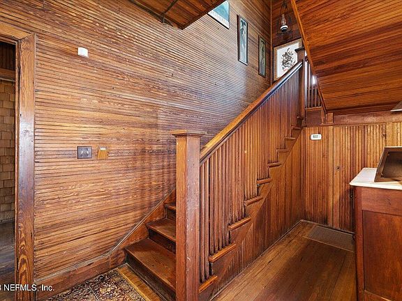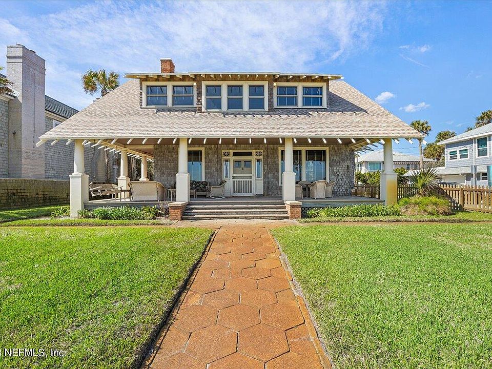 This is the most iconic, quintessential Atlantic Beach home in the ''heart of old Atlantic Beach'' in the location buyers have been waiting for. It sits on a 75' x 200' lot and features the unique history and architecture from 1907 with cedar shake exterior, gorgeous pine flooring, cypress walls throughout and big, inviting oceanfront porch, separate garage with guest suite and a deck. Downstairs features a large great room with big brick fireplace, door windows to ocean view porch, dining room & kitchen with 2 pantries. Upstairs with spacious master suite w/fireplace, widow's walk, his and her baths. 2 other bedrooms, baths, one is giant sleeping dorm. 4 garages and large front and back lawns. This home has been well loved and maintained. Walk to town center to restaurants and shopping.