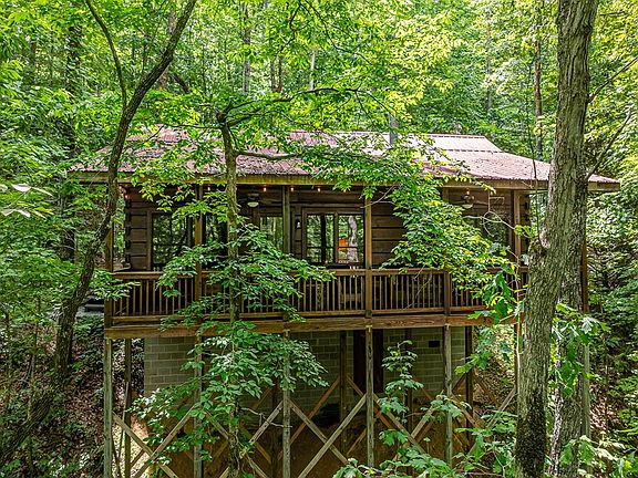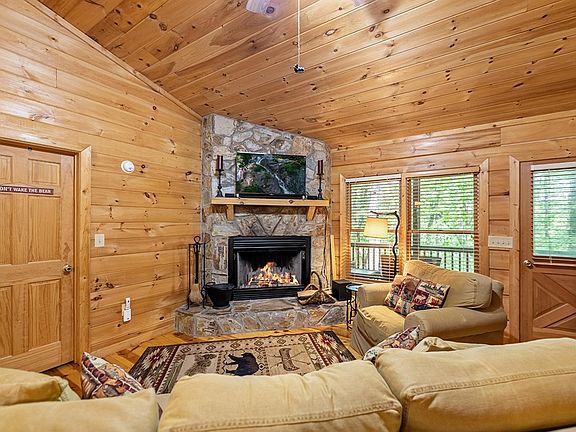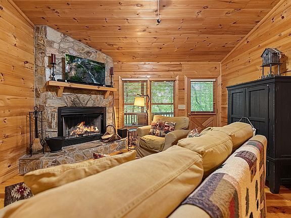 Escape to the serene beauty of Blue Ridge, GA with this charming 2-bedroom, 2-bathroom rustic cabin. Nestled in nature, this cozy retreat is perfect for growing your investment portfolio, or as a delightful weekend getaway. It even comes fully furnished! Step inside to a warm, inviting space with exposed pine ceilings, rich hardwood floors, and a stone wood burning fireplace. The open living area is flooded with natural light, offering picturesque views of the surrounding woods. Both bedrooms are designed for comfort and privacy, each with its own en suite bathroom and rustic accents. The spacious back deck is the highlight of this adorable home, perfect for morning coffee or evening relaxation. The outdoor area includes a fire pit and hot tub, ideal for unwinding and entertaining under the stars. The cabin's prime location offers endless outdoor adventures, from hiking and fishing to exploring downtown Blue Ridge. Nestled on 1.2 ac