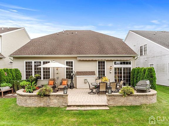 A stunning, decorator's dream, 3 bedroom/ 3 full bathroom Narbeth model in the popular adult community, The Riviera at East Windsor. Elegance and sophistication exude from this home, both inside and out. The first floor, with wide-plank distressed hardwood flooring throughout, has formal living and dining rooms with crown molding, recessed lighting and wainscotting. Continue into the kitchen, with its upgraded 42 cabinetry, lovely granite counters, more recessed lighting, breakfast bar, pantry, and a lovely adjoining expanded breakfast room. Adjacent to the kitchen is the family room with its vaulted ceiling, mantled gas fireplace, recessed lighting, and ceiling fan. There are 10 foot ceilings on the first floor, Hunter Douglas window treatments, central vacuum system, and huge walk-in attic storage. A show stopper is the rear patio, which you may access through sliders from the breakfast room.