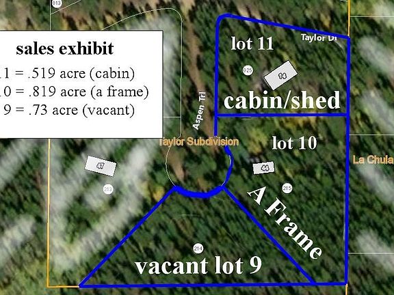 Seasonal cabin. Same family owned property for over 50 years. 3 lots in total = 2.05 acres. Lot 10 with A-frame and household well. Lot 11 with unimproved cabin. Lot 9 vacant land. Aspen Trail is non county maintained road. Without HOA. Great memories for caring family. Subject is being sold "AS IS, WHERE IS, WITH ALL FAULTS". Buyer to verify all data.