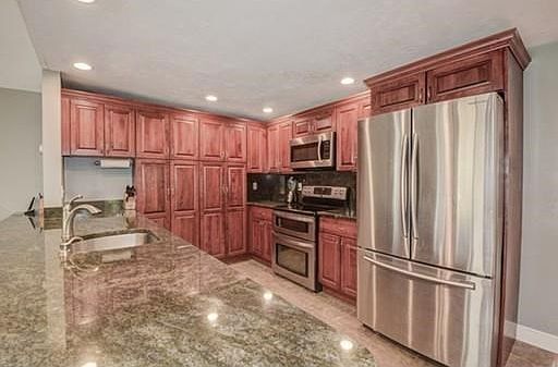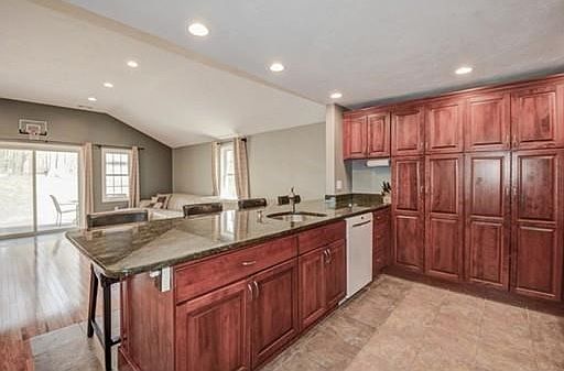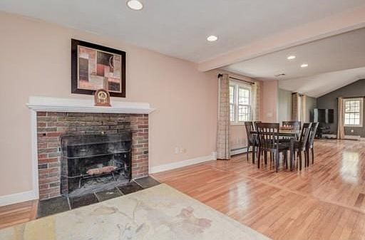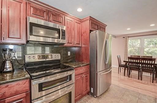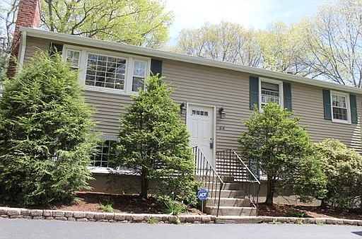 Beautifully updated home with newly remodeled driveway, fresh landscaping in front and gorgeous addition, with great family room. Open floor plan for family room, kitchen & dining area. Great natural light. Fabulous updated Kitchen w/upgraded cherry wood cabinets, stainless steel appliances, granite countertop & backsplash, tile floor, breakfast bar & recessed lighting. Dining area w/hardwood floors. Living room w/hardwood floors & fireplace. All bedrooms w/hardwood floors, closets & recessed lighting. Lower level finished w/guest bedroom or office, full bathroom with shower, laundry room with cabinets. Bonus room with several closets, cedar closet, wood stove and walk out. Updates include **Roof ** Windows **Siding ** Recessed Lighting** Hardwood Flooring **Central Air ** Trek Deck**Driveway. Love basketball ~ your own basketball court. Shed for storage. Use the commuter rail ~ walking distance to train into Boston. Great location for commuting, close to highways, PIke, Rte 9 & 495