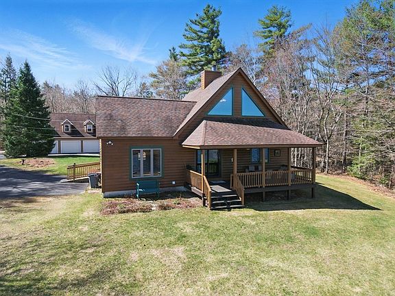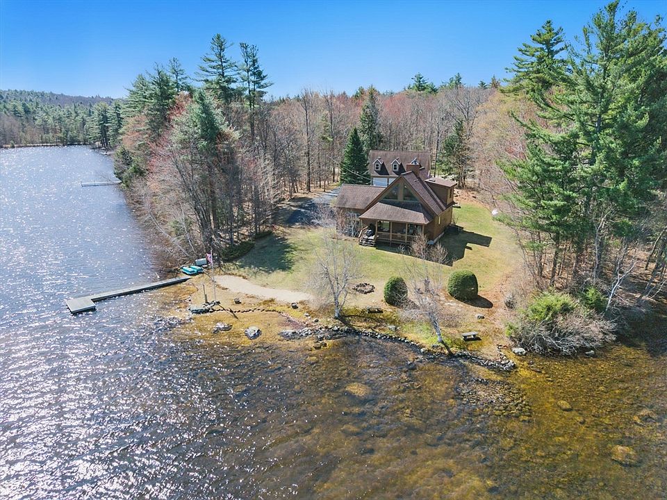 UNMATCHED LAKESIDE LIVING ON 1.1 ACRES! This stunning log-sided home offers a modern kitchen, 2 bedrooms, a lofted en-suite primary, two ¾ baths, vaulted ceilings, and a whole-house generator—blending rustic elegance with modern comfort. Enjoy 220 feet of pristine Sunrise Lake frontage with sandy beach, private dock, and sweeping 180° lake and mountain views. The Great Room, Kitchen, and huge covered deck are perfect for entertaining or relaxing with majestic sunrise & sunset views. The sun-drenched lot is very private, while a detached 3-car garage with finished space above offers endless options. Whether you're after quiet retreat or lakeside fun, this home delivers the best of New Hampshire’s lake life. DON’T MISS THIS RARE WATERFRONT GEM!