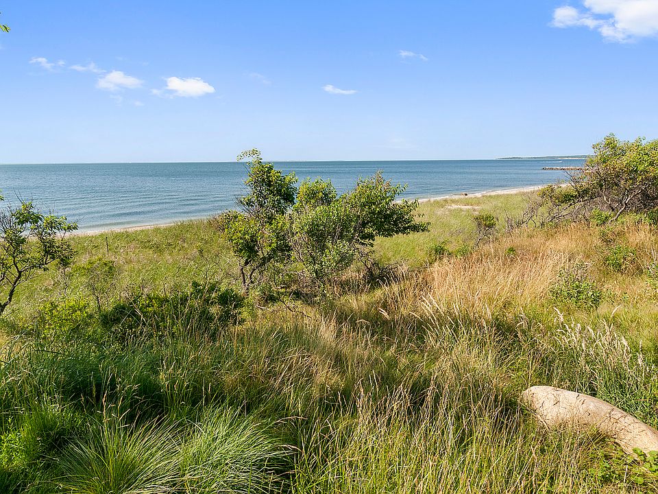 Dramatic elevated open beachfront building lot in East Hampton. Room for large house and swimming pool. Dock your boat at the private community marina across the street. Jump into the bay just outside your door. Unique.