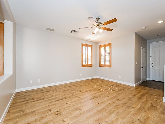 This move-in-ready Las Vegas, NV rental home has plenty to offer, including three bedrooms, two and a half bathrooms, and a charming exterior with a two-car garage and a covered front porch. The home's layout includes an upstairs bonus loft plus an expansive living room, complete with vinyl plank flooring and attractive plantation shutters to match. A ceiling fan offers comfort year-round. Highlights of the modern kitchen include stainless steel appliances, a deep basin sink with a gooseneck faucet, and lots of cabinet space. Access the fenced-in yard outside via the sliding glass doors in the dining area. Spread out in the huge main bedroom suite upstairs. It comes with an oversized walk-in closet plus a smaller additional closet in its en suite bathroom. Don't wait to schedule your tour!