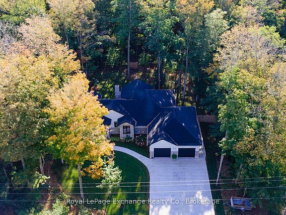 Welcome to 44 Blairs Trail serene retreat in the coveted lakeside community of Blairs Grove, where sandy shores and breathtaking sunsets over Lake Huron are just steps from your door. This 2021 custom-built bungalow, offers more than 3,400 sq. ft. of finished living space with 2,050 sq. ft. on the main floor and another 1,350 sq. ft. in the finished lower level. Set on a private half-acre, this home is a rare blend of luxury, craftsmanship, and comfort. Inside, soaring 9-foot ceilings on the main floor and oversized windows create a bright, open atmosphere. At the heart of the home, the chef-inspired kitchen boasts quartz countertops throughout, a 10-foot waterfall island, custom cabinetry, and a spacious walk-in pantry. The space flows seamlessly into the dining area and inviting great room with a cozy gas fireplace, then out to the covered rear deck (19 26)where a stone wood-burning fireplace and natural gas BBQ hookup invite year-round entertaining. The primary suite offers privacy and tranquility, while two additional bedrooms and a 4-piece bath create a separate guest wing. The lower level expands the living space with a recreation room, gas fireplace, billiards area, full bath, and two framed bedrooms allowing for up to six bedrooms in total. Every detail reflects superior construction: 9-inch poured concrete foundation walls, 2x6 framing with insulated sheathing for true thermal break, R-27 insulated walls, R-60 ceiling insulation, and 50-year Timberline shingles. The exterior shines with LP Smart Side maintenance-free Board and Batten siding accented by stone, and a fully fenced backyard with custom wrought iron railings. Just minutes from Kincardines amenities, dining, trails, and shops but tucked into a peaceful, tree-lined neighbourhood this home offers the perfect balance of modern functionality and lakeside serenity.44 Blairs Trail is more than a home its a lifestyle where quality, comfort, and coastal beauty come together.