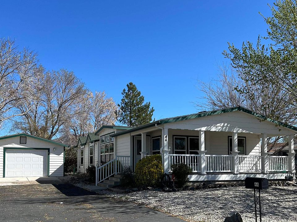 This charming home situated in a peaceful neighborhood. The property features a delightful covered patio, perfect for enjoying your morning coffee while admiring the incredible view of the Sierras. You can also indulge in your favorite beverage while feasting on delicious meals and admiring the stunning Nevada sunsets. The kitchen is perfect for the house chef, with stunning granite countertops and modern stainless steel appliances.You'll have ample storage with large pantry and a abundance of cabinetry, You will find a large primary bedroom with a walk-in closet. There is an extra room adjoining the primary bedroom that could be made into a third bedroom or office. Plenty of room for parking an RV or boat and an oversized detached 1-car garage and workshop area. Mature trees and zero scapes for easy upkeep. Don't miss your opportunity to tour this great home.
