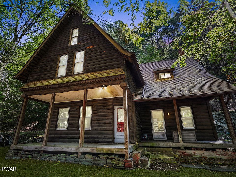 This 4-bedroom, 2-bathroom historical log-sided home rests on a private half-acre in White Mills, steeped in the legacy of the Dorflinger family, founders of the world-renowned Dorflinger Glass Company, whose creations graced the tables of eight U.S. Presidents from Abraham Lincoln to Theodore Roosevelt. The founder's daughter owned this home for many years, adding to its legacy. Built in 1890, this extraordinary residence has been cherished by only three families, with the current owners carefully maintaining and updating it for over five decades. Surrounded by towering evergreens, long stone walls, and neighboring historic homes, the property captures the spirit of another era and offers a rare glimpse into White Mills' storied past. Arrive by the private driveway or park below and ascend the scenic stone steps for a memorable approach. A broad covered front porch stretches across the facade, inviting you to pause and admire the enduring craftsmanship of the log siding. Inside, you are welcomed by hardwood floors and an atmosphere of timeless character. The updated kitchen combines modern convenience with traditional warmth, while the spacious living room is highlighted by custom woodworking and a classic brick fireplace that anchors the space with historic charm. A first-floor bedroom with multiple closets and a full bathroom with a tiled walk-in shower complete the main level. Upstairs, the hardwood flooring continues into a large primary bedroom with multiple closets, alongside two additional bedrooms--one generous in size and one more intimate--sharing a full bathroom. Each room reflects the enduring appeal of 19th-century craftsmanship. Outside, the setting is enchanting. Stone ruins, rustic outbuildings, and a log shed are tucked among the trees, while the home is framed by layered stone walls and mature landscaping that provide privacy and permanence. This is more than a residence--it is a rare opportunity to own a living piece of history.