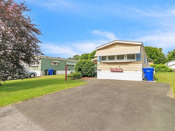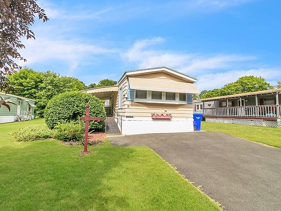 This wonderful 55+ community is tucked away in a quiet Sixteen Acres neighborhood. Enjoy an easy lifestyle in this single wide 14x70. Living room has a fireplace and is open to the eat-in kitchen with range, refrigerator, dishwasher and abundant cabinet space. Two bedrooms with wall to wall carpets, TWO full bathrooms with tubs and showers, and laundry closet complete the floor plan. Outside enjoy a covered patio, large shed and 2 parking spaces. Additional features include gas heat, central air, newer roof (2016 APO), and replacement windows and kitchen slider. Low monthly fees include water, sewer and taxes.