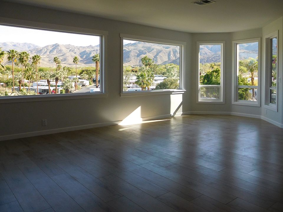 Exceptional desert views are yours to enjoy from this premier location. Light and bright with expansive windows and open concept living space. This 1,700 plus sq.ft.home is newly remodeled. The modernized great room floor plan is perfect for entertaining. The designer chefs kitchen features shaker cabinetry, large island, quartz counters and stainless steel appliances. Other features include 2 large bedrooms/2baths and a den. The beautifully remodeled bathrooms include ensuite with double sinks, large vanity, 5' shower and freestanding tub. Highlighted by luxurious lighting and Calacatta porcelain feature wall. The bonus sunroom could easily be converted to an art or yoga studio, a gym, or simply extra storage space. The options are endless. Completely drywalled with hardwood floors throughout. An oversized covered carport and low maintenance landscaping, round out this appealing home. Located in the family friendly Silver Spur community in beautiful South Palm Desert is sure to please!