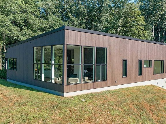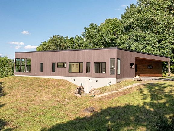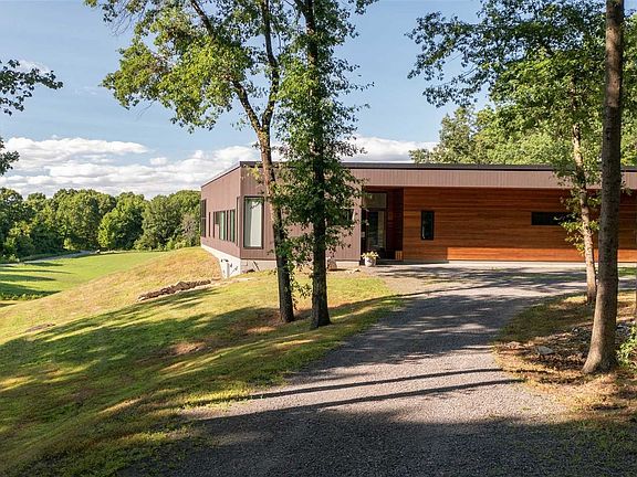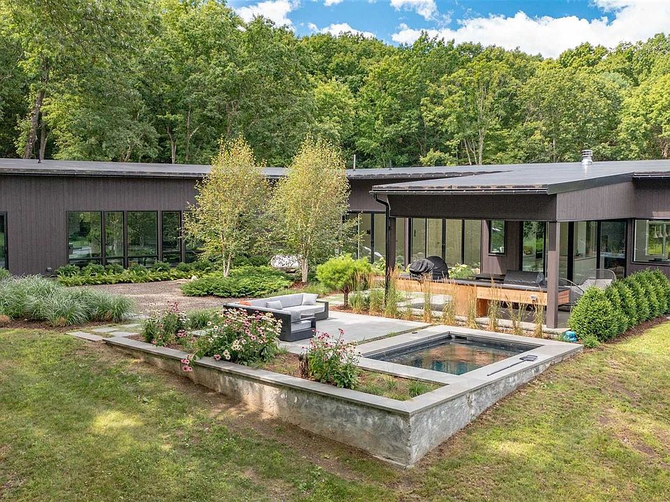 One of the many wonderful features of this modern design are the large, unadorned windows of various shapes and sizes that highlight the natural surroundings. Sunlight fills this home with a glow and warmth, creating a brighter, happier atmosphere to live and work. The color palette inside and out uses textures and natural colors to draw focus to unique architectural elements, and the muted tones are calming and serene. Convenience and energy efficiency are addressed by allowing owners to control systems and amenities through smart-home tech. Peace of mind comes with remote monitoring capabilities as well as control of heat, A/C, lights, security and more. Greeting you as you approach the home is a distinctive recessed entrance. The large window to the right of the front door gives a sneak peek of the dramatic gallery hallway with a wall of glass that exposes a private, landscaped courtyard. The main living volume with dramatic glazing creates a strong connection with nature and looks out over a spectacular setting. The two-sided wood-burning fireplace services the living and media rooms, and lends some atmosphere to the nearby dining and kitchen spaces. Well-appointed with Pedini cabinetry, Caesarstone tops, Miele appliances and Hansgrohe fixtures, the kitchen is a cook's delight ... and only steps away from a custom, built-in dinette as well as sliders to an outdoor, covered entertaining space with grilling station and pizza oven. Down the main hallway are two gracious bedrooms, each with its own sumptuous, private bath. The primary suite is its own wing of the home, and is the epitome of luxury and privacy. The ample bedroom leads to a gym and changing room that transitions into a spa-like bath with soaking tub, massive steam shower, generous vanity and water closet. With a liberal window schedule (and automated Lutron privacy shades), the primary suite enjoys enchanting views of gardens and nature. The high ceilings throughout this home add a wonderful sense of volume to every space, while the natural tone of the wide board flooring adds warmth. The landscaped courtyard is an outdoor oasis, offering a covered patio, custom lighting, plunge pool, bluestone pathways and quite sitting areas. Notable creature comforts of this home include high-efficiency propane heat, central air, automated standby generator, smart-home tech, LED lighting and security. All of this on 14+ acres and less that 10 minutes to the center of Rhinebeck villa