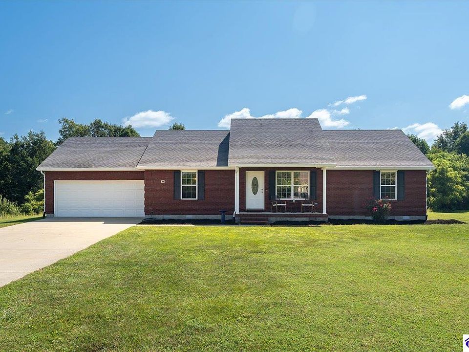 Welcome to this beautifully maintained 3 bedroom, 2 full bath, ranch home in the desirable Santa Fe subdivision! The interior features a gorgeous open concept with vaulted ceilings and tons of natural light. The primary bedroom has a walk-in closet and en suite bathroom with a walk-in shower. The other two bedrooms provide plenty of space for your furniture and they are already painted to a modern color. The dining area is attached to the kitchen, which has plenty of counter space and elbow room for all of your cooking needs. The seller will be providing a new kitchen fridge before transferring to the new owner. The 2 car attached garage is painted and has plenty of room for all tools and storage. On the exterior, you’ll have 2.249 acres to explore! There is a concrete, private patio on the back of the home that overlooks the wooded portion of the property, the perfect place for relaxing or entertaining. You’ll also enjoy spending time on the covered front porch which has beautiful surrounding views within the cul-de-sac. There will be a new roof for the new owner as well! The seller has loved living here and has put a lot of care into the home. So don’t miss out on this opportunity, come take a look for yourself today to see if you can make this your NEW Kentucky home!