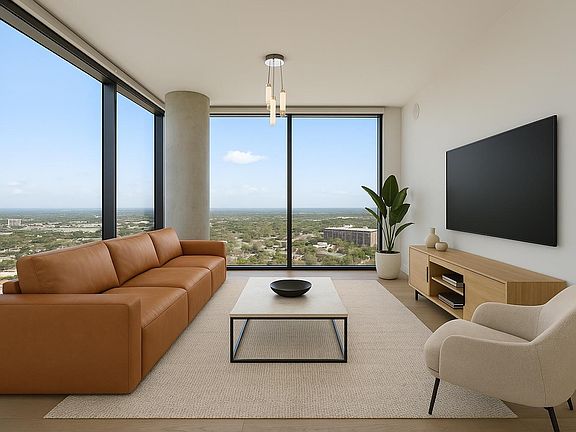 Floor to ceiling windowsCorner unitDramatic finish-outBlack cabinetry and countertopsViews of east austinPre-wired surround soundSofi motorized shades