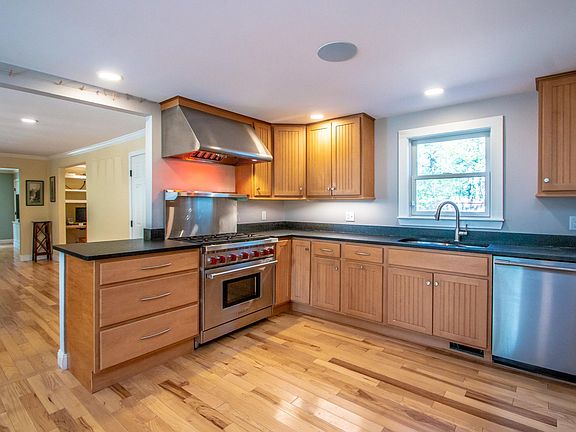 An outdoor enthusiast's dream home! Just minutes from Cranmore with hiking, mountain bike, and snowmobile trails just out the back door, this meticulously updated house features a gourmet kitchen with leather granite counters, pantry, and double wall oven/microwave. Enjoy cooking on your professional Wolf range with warming shelf before gathering around the dining room's gorgeous wood stove at the heart of the home, which boasts stunning solid hickory wood floors in the kitchen, dining, living room, and office nook. An oversized rec room with soaring vaulted ceilings leads out to a fenced-in backyard with a playhouse. Or, take in the tranquil surroundings, which include a garden area with mature high bush blueberry bushes, from the spacious sunroom or covered porch. Storage abounds thanks to a custom mudroom, gear room, large entry with bike storage, attic, and a 3-car garage/workshop with overhead space. In addition to 3 roomy bedrooms, you'll also find plenty of extra sleeping spaces and ample parking for guests. Well-positioned in the established Redstone neighborhood right near the North-South Road, this one-of-a-kind home is just minutes from the soon-to-be-built rec path and everything else the Valley has to offer! Broker interest.